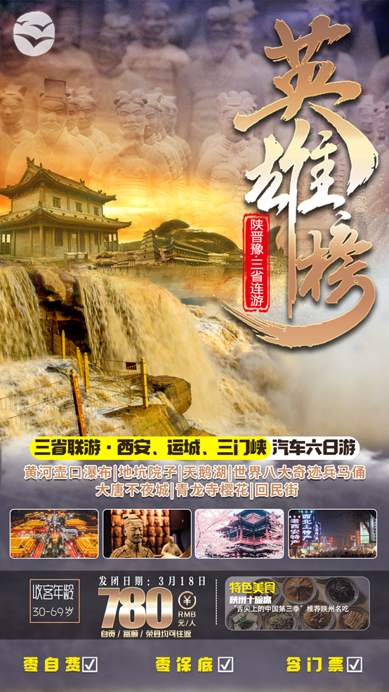 全程精选景点:昭化古城、黄河壶口瀑布、秦始皇兵马俑、大唐不夜城、曲村地坑院、青龙寺樱花、七彩盐田等
