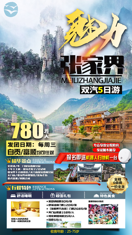 精华景点:芙蓉镇/不二门国家森林公园/野溪温泉/张家界千古情景区/天门山国家森林公园/溪布老街/墨戎苗寨/凤凰古城