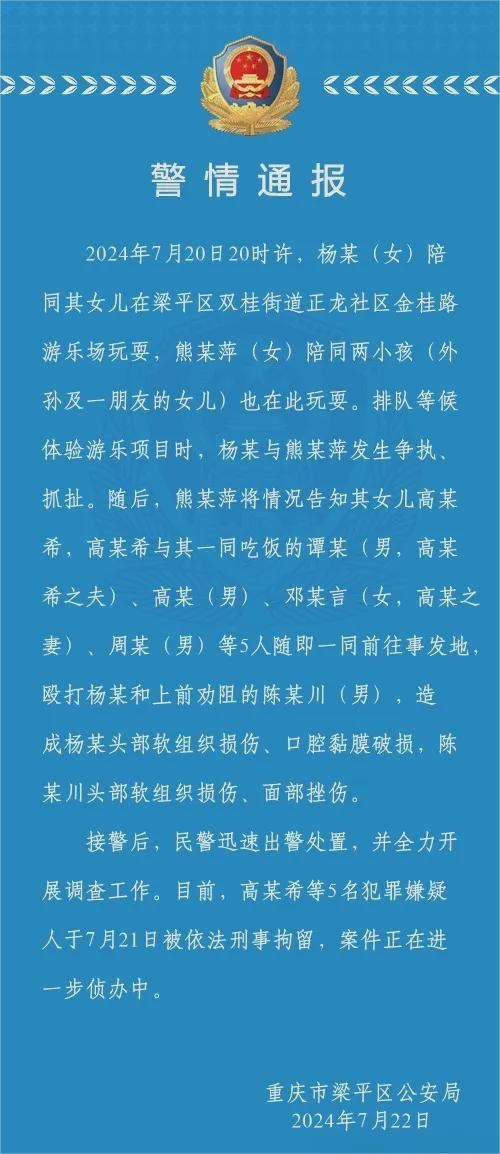 ·多人在重庆某游乐场争执打架,警方通报:5人被刑拘。