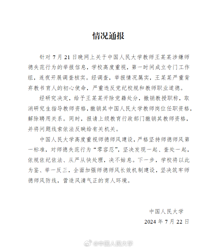 ·中国人民大学通报教师王某某被举报性骚扰事件:情况属实,解除聘用关系。北京海淀公安介入调查。