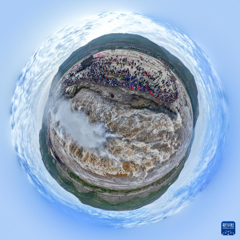 国庆长假期间,位于山西省吉县和陕西省宜川县交界处的黄河壶口瀑布迎来众多游客,观赏“黄河之水天上来”的壮观景象(10月4日摄,无人机全景照片)。