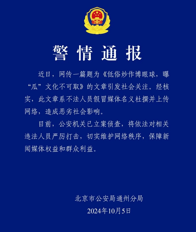 ·男明星粉丝涉嫌伪造官网文章?北京通州警方:已立案侦查。