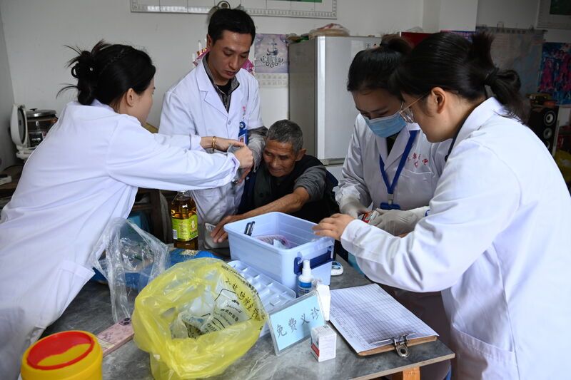 “您的血压是144(收缩压)77(舒张压),您这个年龄是正常的;您的餐后血糖8.9,也是正常的……”张栋良落座接受体检后,通过血压、血糖、内科检查后,医生告诉了各项体检结果,和老张一起接受了免费上门体检的,还有他的老伴。在该村,还有年近80岁的退役老兵张兴元夫妇也接受了免费上门体检。