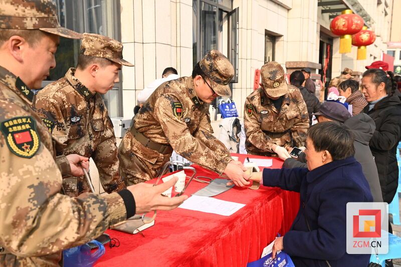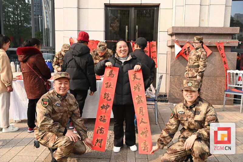 春联寄福,墨香传情。义务写春联区,退役军人志愿服务队队员莫玉文、张韩从上午10点至11点40分,连续创作近100副春联。“天增岁月人增寿,马跃乾坤福满门”“春到百花香满地,时来万事喜临门”等佳句,既承载传统年味,又传递美好祝愿。感冒未愈的志愿服务队指导员谢林及队员傅钰娟、邓大勇等主动协助,确保活动顺利进行。
